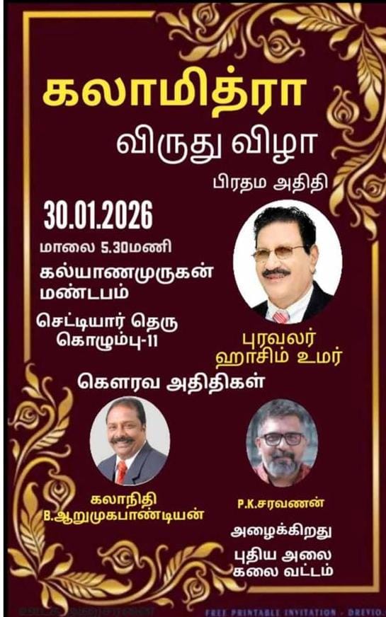 46வது ஆண்டில் கால்பதிக்கும் புதிய அலை கலை வட்டத்தின் கலாமித்ரா விருது விழா 30.01.2026 கொழும்பு 11 செட்டியார் தெரு கல்யான முருகன் மண்டபத்தில் ஸ்தாபகர் சிரேஷ்ட ஊடகவியலாளர் கலைஞர் ராதா மேத்தா தலைமையில் நடைபெற்றது. இந் நிகழ்வில் இவ் அலை…